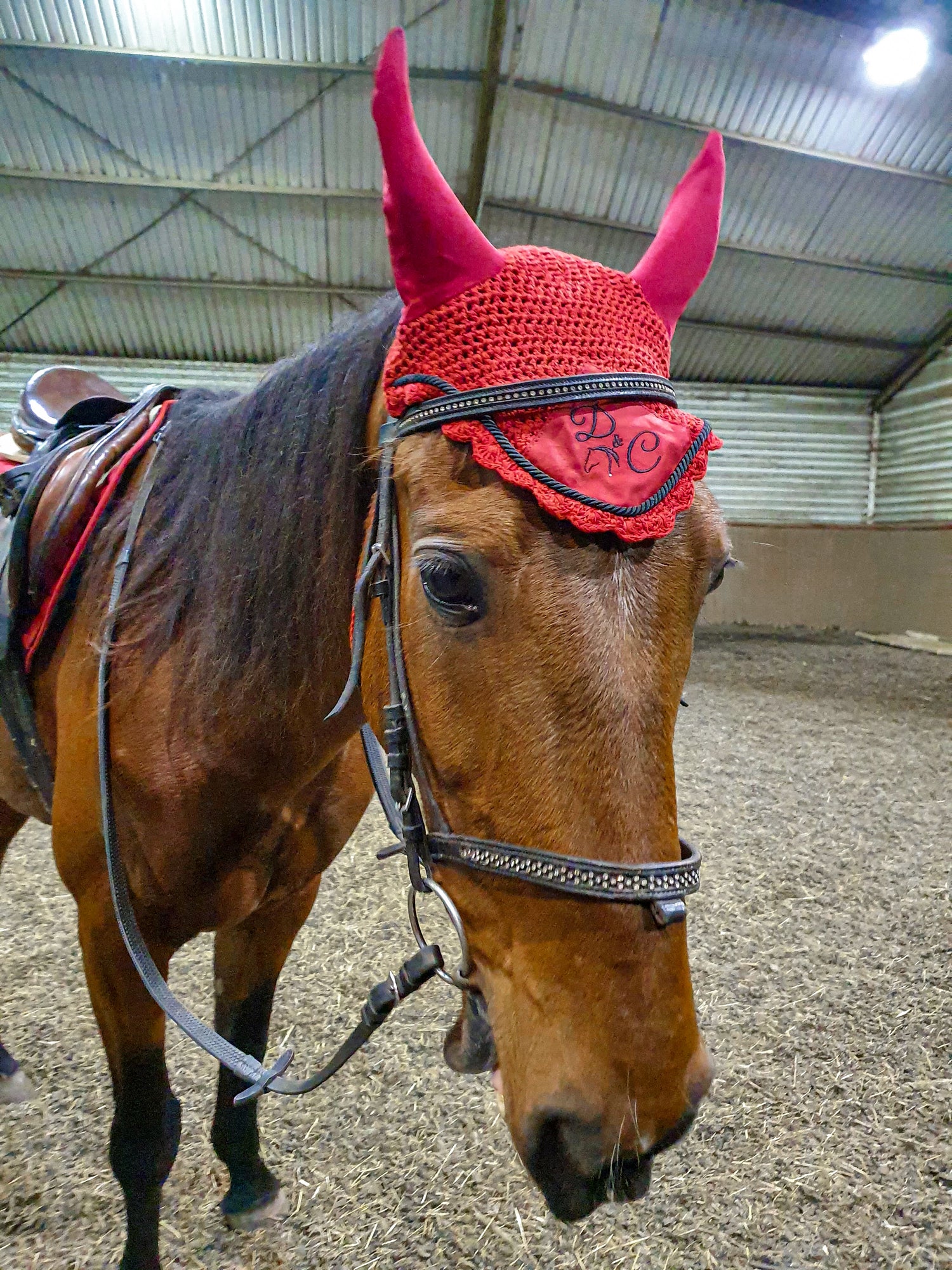 Ruby Red fly veil with stretchy lycra ears to comfortably fit your horses ears