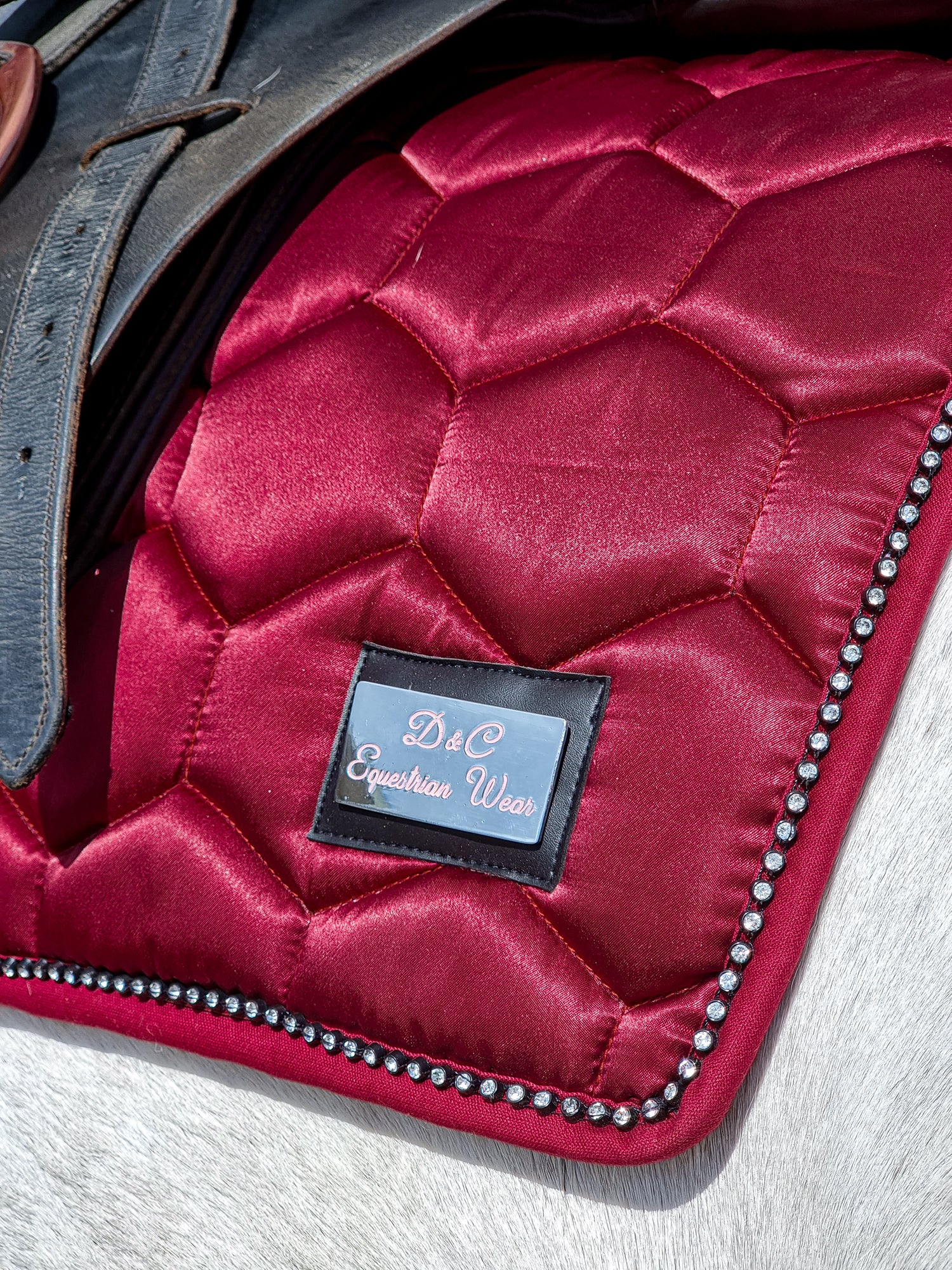Our Satin saddle pads feature a padded front for comfort for your horse, girth straps and crystal piping to create that beautiful elegant look. Finished off with an elegant metal logo for the final polished look.